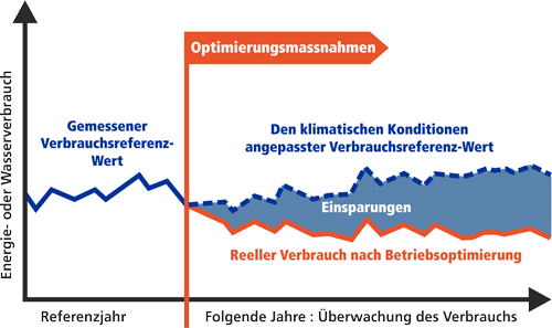 Der Verbrauchsreferenz-Wert entspricht dem jährlichen Energie- (Wärme, Kälte, Elektrizität) und Wasser-Verbrauch vor der Optimierung der technischen Installationen.